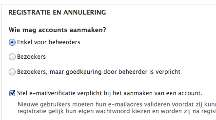 - Klik door naar instellingen >> accountinstellingen (admin/config/people/accounts)