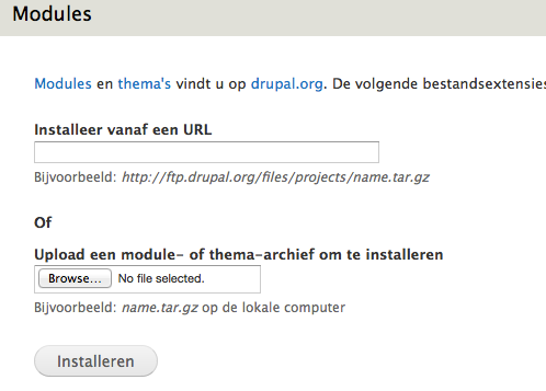 - Via de website interface: modules >> nieuwe module toevoegen (admin/modules/install)