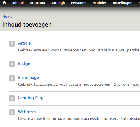 Wil men een meer geavanceerd contact-formulier of een ander soort webformulier[2], dan wordt in drupal doorgaans de webform module gebruikt. Die installeert op de hierboven beschreven manier(en). Na installatie komt er een nieuwe optie bij in het ‘Inhoud toevoegen’ menu.